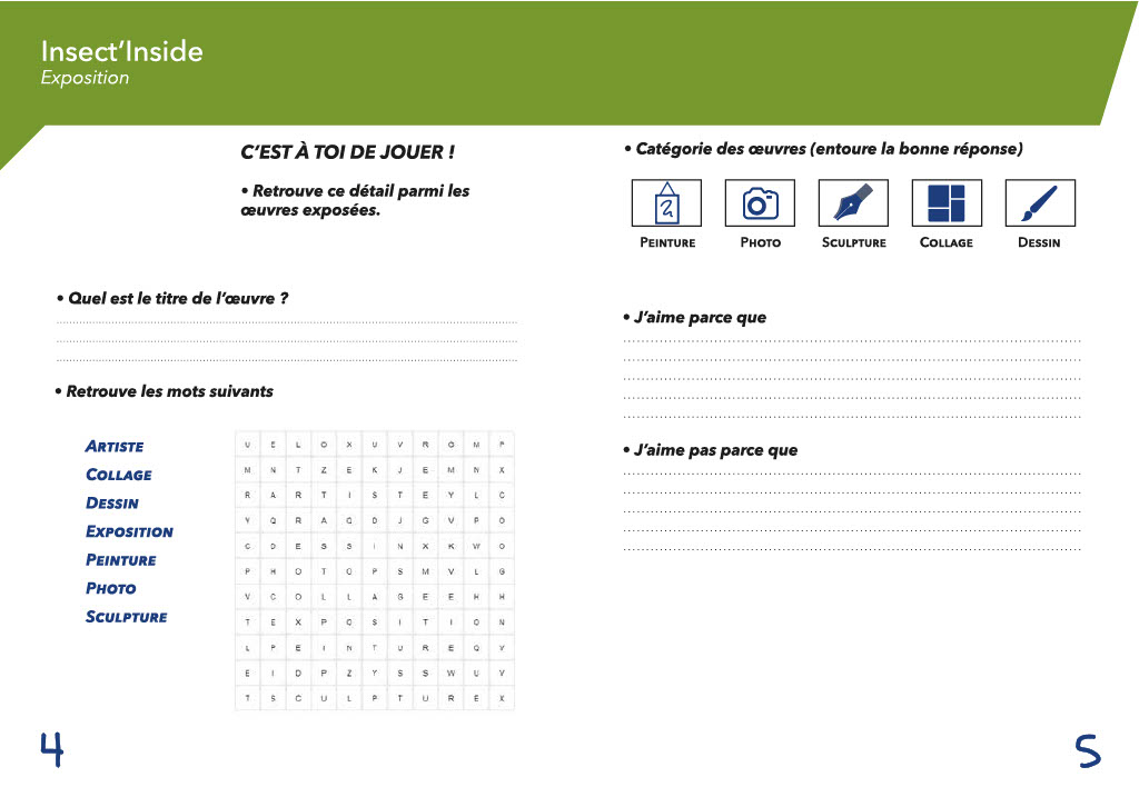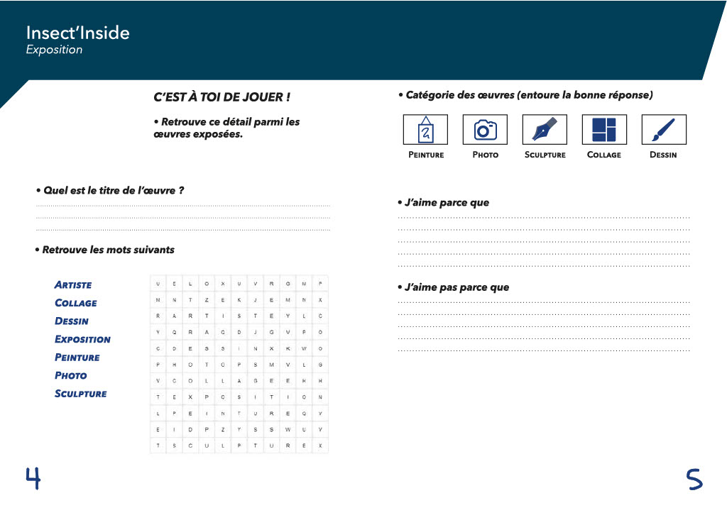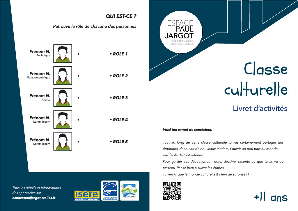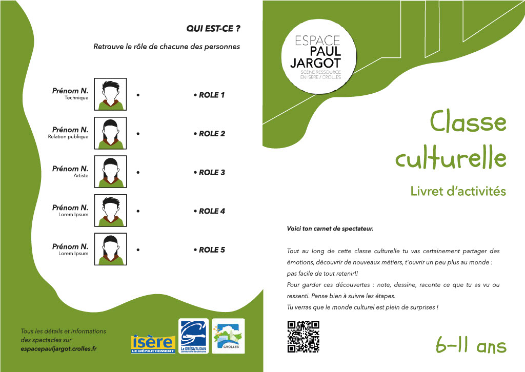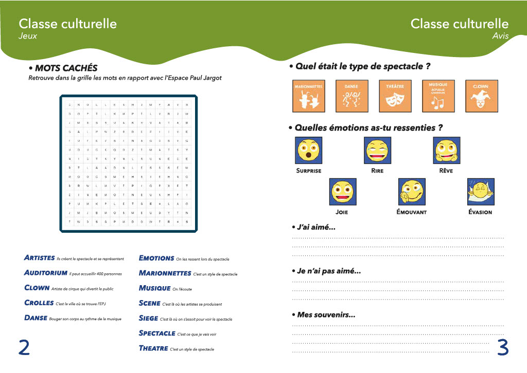 Ma tâche consistait à réaliser des livrets destinés aux classes culturelles contenant des contenus pédagogiques tels que des informations sur les spectacles et expositions et des jeux ludiques en lien avec l’Espace Paul Jargot.