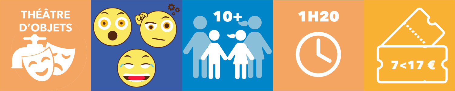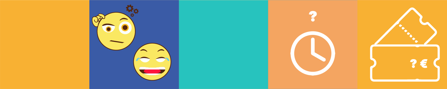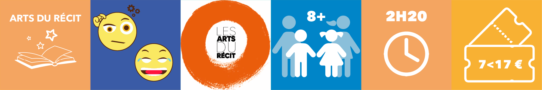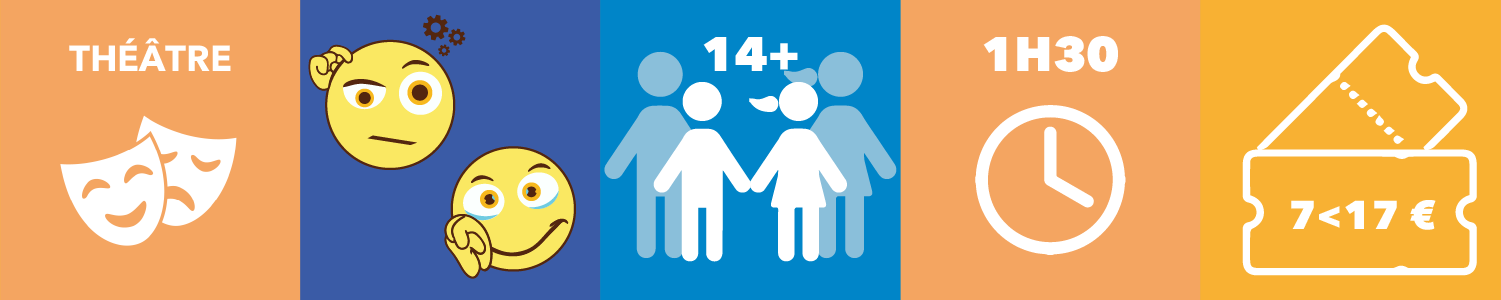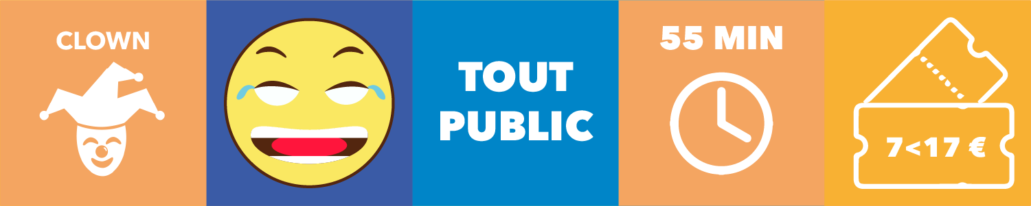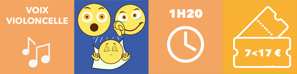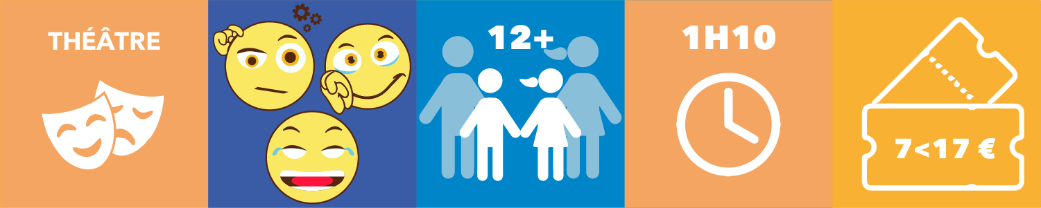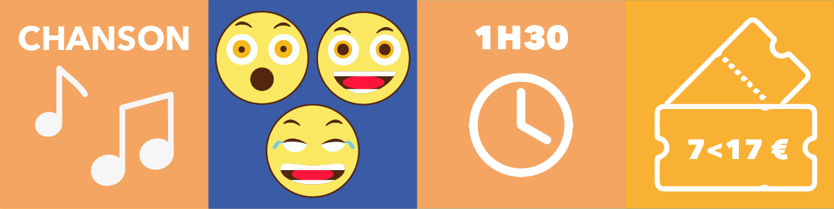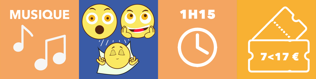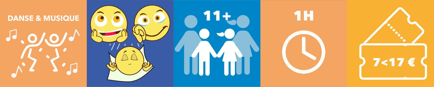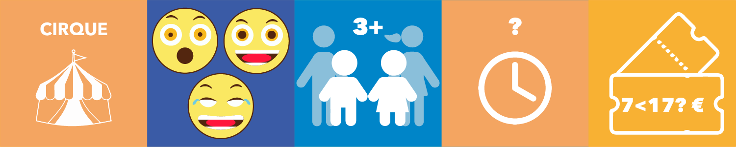 Les bandeaux donnent les informations essentielles à savoir le type de spectacle, les émotions auxquelles les spectaurs devront s’attendre, la durée, le prix et l’âge. Chacun des bandeau est affiché pour chaque spectacle sur le site web et ainsi améliorer l’accessibilité et la clarté des informations.